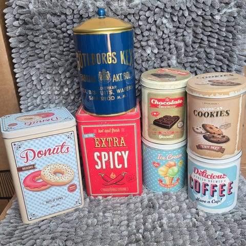 Grön plåtburk med lock för förvaring av exempelvis tvättmedel, två fack och skopor