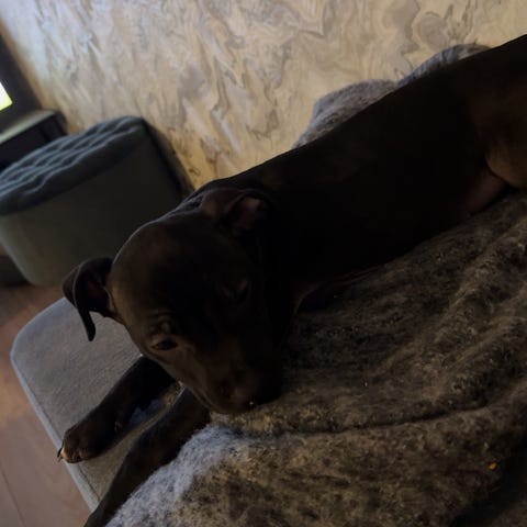 Hon är en Amstaff × American Bully-mix, 1 år och 7 månader gammal, frisk och välskött.