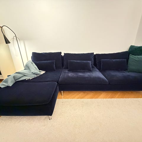 IKEA soffa Söderhamn med schäslong i tyg "Hillared mörkblå". Mycket bra skick, nypris 7790kr.