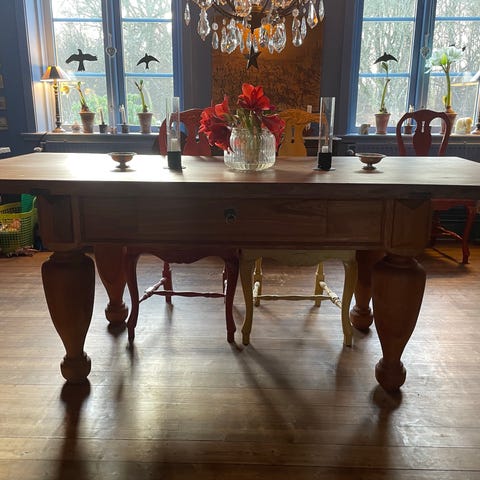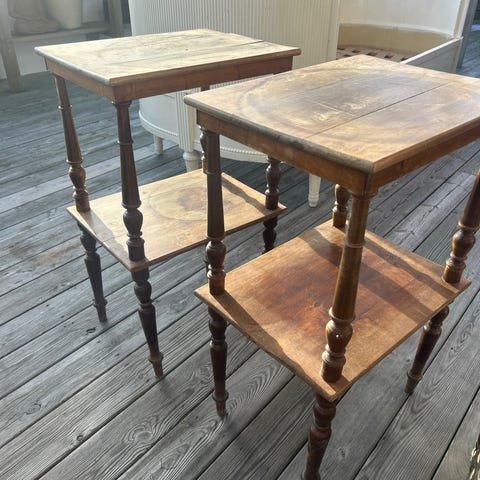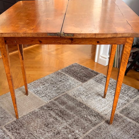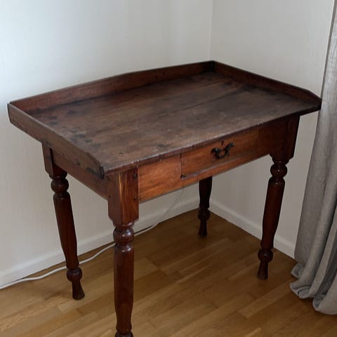 sidorna. Bordet har två lådor för förvaring av mindre saker. Passar som matbord, sidobord eller extra avlastningsyta i kök, vardagsrum eller hall. Träytan visar synligt slitage och patina.