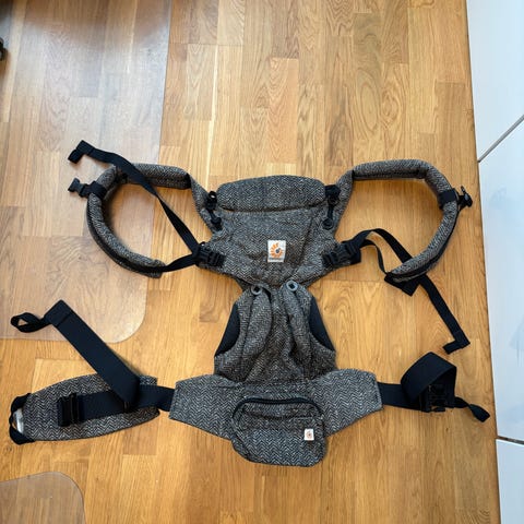 Ergobaby Omni 360 bärsele och ringsjal för bärande av barn. Bärselen är i grön textil med justerbara remmar och midjebälte. Den har flera spännen för säker fastsättning och en liten avtagbar förvaringsficka framtill. Ringsjalen är från Yaro slings i beige tyg och kan användas för att bära barnet nära kroppen. Båda produkterna är avsedda för bärande av spädbarn och småbarn, med möjlighet att anpassa passformen efter bärarens kropp. Man får bärsjalen på köpet av bärselen.