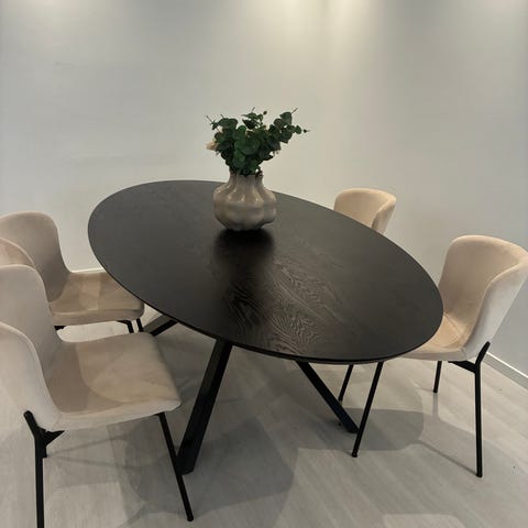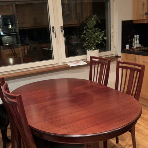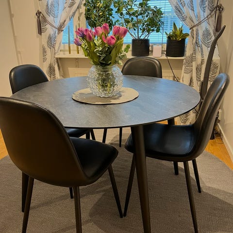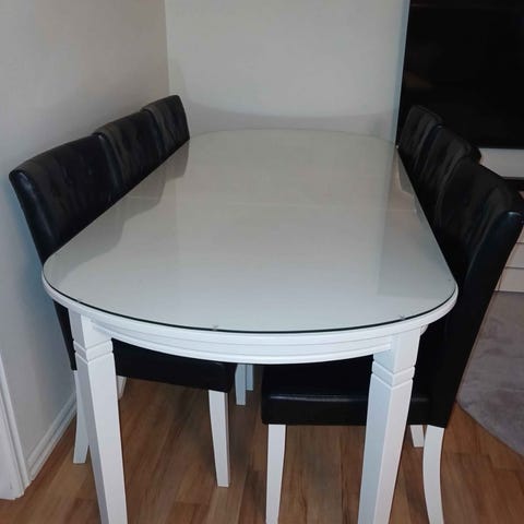 Matgrupp med 8 stolar inklusive glas. Trä modell med skinn stolar. Pris kan diskuteras vid snabb affär