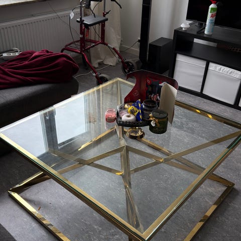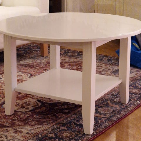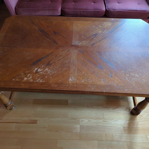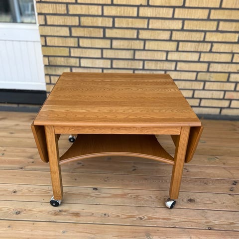 Rektangulärt soffbord i mörkbrunt trä. Bordsskivan består av flera längsgående träplankor med synliga skruv- eller nitdetaljer längs kanterna. Bordet har kraftiga, svarvade ben i samma träutförande. Passar som soffbord i vardagsrum eller som sidobord i större rum.