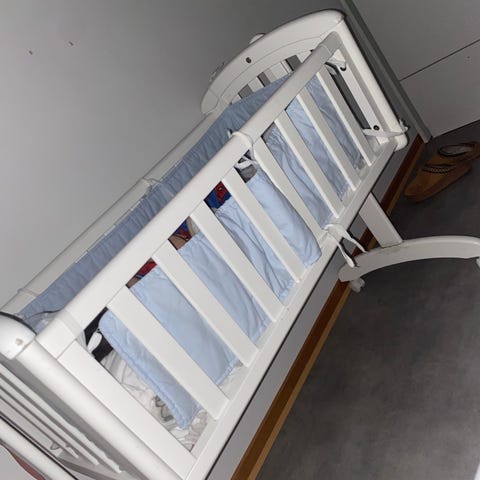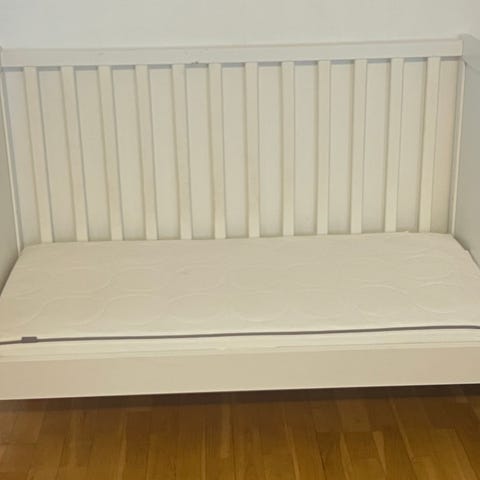 IKEA spjälsängsmadrass i vitt tyg. Madrassen är avsedd för spjälsäng med innermått cirka 60x120 cm, enligt etiketten på sidan. Yttertyget har dragkedja vilket underlättar av- och påtagning. Passar som liggunderlag i standardspjälsäng för små barn.
