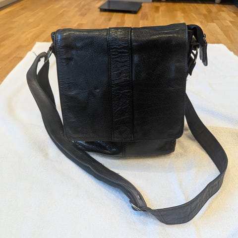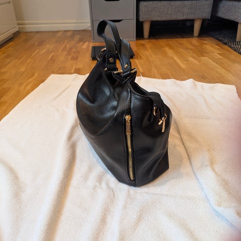 En snygg svart axelrem väska med silvriga metall detaljer. Den är helt ny och jag vet inte vilket märke det är samt osäker på om det är skinn eller konstläder. Väskan är otroligt snygg och elegant. Många olika fack så att man får plats med det allra nödvändigaste. Den har en elegant och dyr look. B: 22 cm, H: 18 cm B: 10 cm.