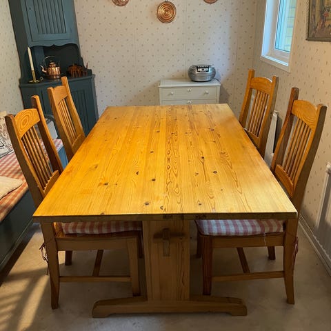 Säljer ett stabilt och fint furubord med iläggsskiva, inklusive 4 matchande stolar. Perfekt som köksbord/matbord.