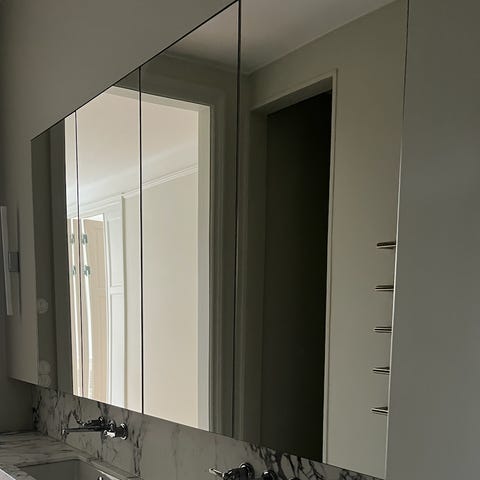 Detta är ett exklusivt och stilrent skåp med dubbelsidiga spegeldörrar och glashyllor invändigt. Skåpet har en liten fabriksskada på ena sidan (se bild), men detta är inget som påverkar funktionen. Skadan kan enkelt döljas med en liten dekorationsdekal, täckbricka, eller om skåpet monteras mot en vägg/hörn så att sidan inte syns.
