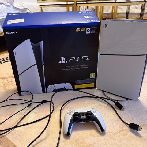 Sony Playstation 5 spelkonsol i vit färg. Stationär konsol med stöd för moderna PS5-spel samt bakåtkompatibilitet med många PS4-titlar. Konsolen har inbyggd lagring, nätverksanslutning och USB-portar för tillbehör. Lämplig för användning i vardagsrum eller spelhörna tillsammans med kompatibla handkontroller och tillbehör från Sony Playstation-serien.
