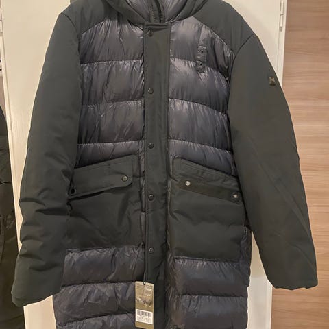Svart pufferjacka från Moose Knuckles med hög krage, stor huva och dragkedja framtill. Jackan har quiltad design, bröstficka med dragkedja och två stora fickor med lock. Perfekt för kalla dagar och riktigt varm.