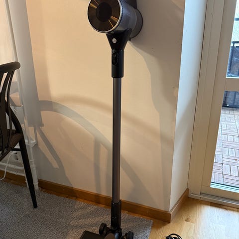 Den har en skärm som visar kraft och felmeddelande (tex igentäppt skaft), indikator för batteri, ställbar längd från 90cm till 115cm (funkar perfekt för min sambo som är 165 och mig som är 185), går även att använda som hand-dammsugare för tex bord eller för att städa i bilen.