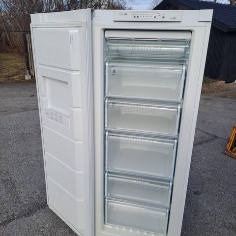 Whirlpool frys i vit färg. Fristående hög modell med frontöppning och flera genomskinliga fryslådor för överskådlig förvaring av frysta varor. Den visas till vänster i bilderna.