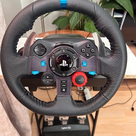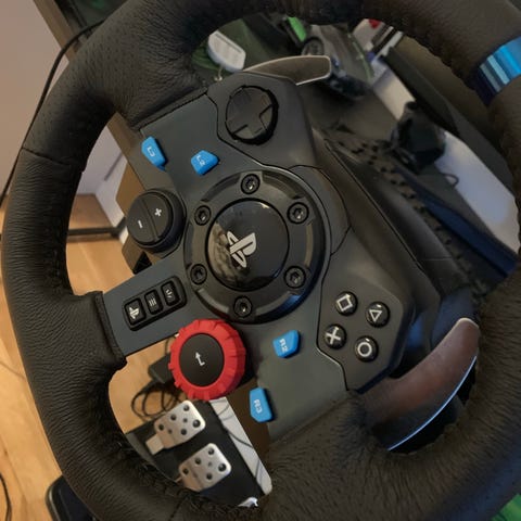 Logitech G29 racerratt med pedaler och separat växelspak. Ratten har inbyggda knappar anpassade för PlayStation samt växelpaddlar bakom ratten. Pedalenheten har tre pedaler för gas, broms och koppling. Växelspaken är manuell med H-mönster. Utrustningen är avsedd för racingspel och ansluts med kablar till kompatibelt system.