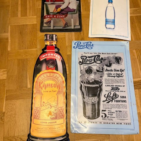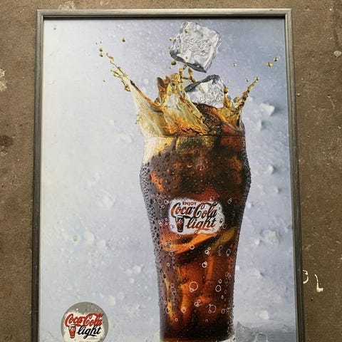 Coca-Cola reproduktion emaljerad reklamskylt flaska flerfärgad