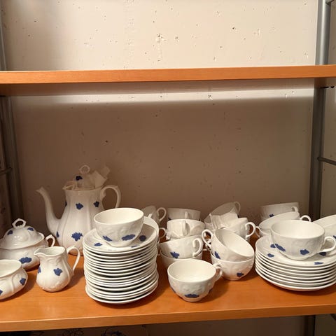 11 tallrikar, 11 koppar, 11 fat, tekanna, sockerskål och mjölkkanna