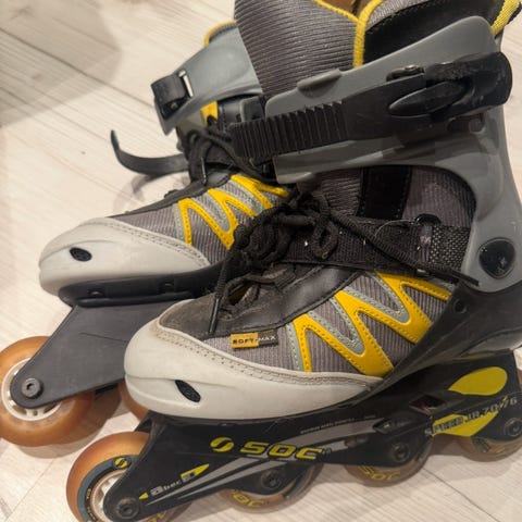 Abec7 justerbara inlines (strl 35 till 38) i svart och neongul färg. Modellen har hårt yttre skal med vadderad innersko och justerbar storlek via knapp på sidan av skenan. Stängning med snörning, kardborreband och spänne. Fyra hjul på varje skridsko med plastchassi och broms bak på ena skridskon.