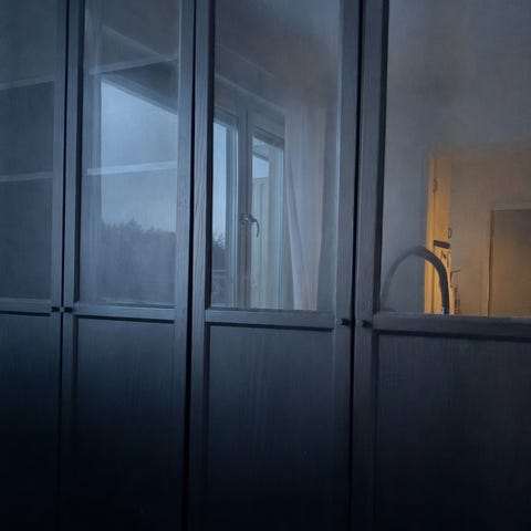 Finns 4 st skåp med dörrar, en dörr har trasigt glas