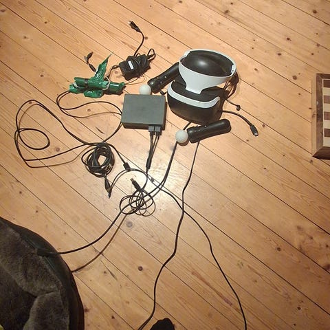 Sony Ps VR headset med tillhörande kablar och anslutningsbox.