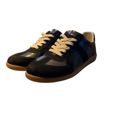 Snygga sneakers från Philippe Model i olivgrönt och beige med svarta skosnören. Ovandelen är i mocka, mesh och glansigt textilmaterial.