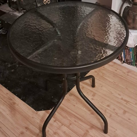 Runt glasbord utebord med metallstativ. Bordsskiva i genomskinligt strukturerat glas och underrede i metall med fyra ben. Hål i mitten av bordsskivan för eventuell parasoll. Passar som utebord på balkong, altan eller i trädgård.