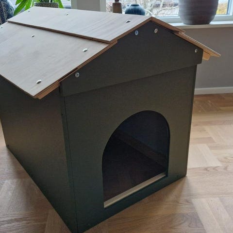 Avtagbart tak. Taket görs med få grader så att hunden utan problem kan välja att ligga ovanpå kojan.