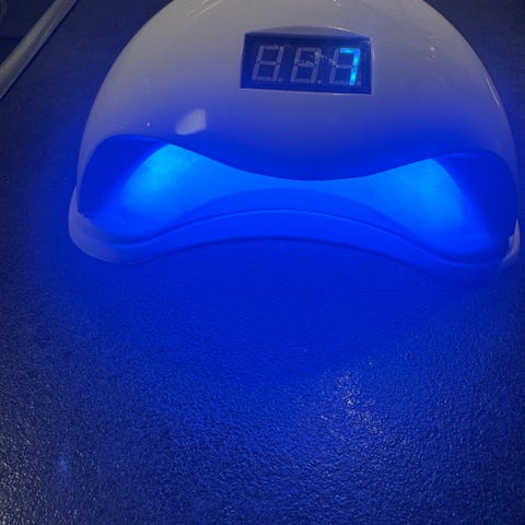 Depend Gel iQ LED-lampa för härdning av gelnagellack. Vit enhet med flera LED-lampor på insidan och strömbrytare på ovansidan. Ansluts med kabel och används genom att placera fingrarna under lampan för att härda Depend Gel iQ-lack enligt bruksanvisning från tillverkaren.