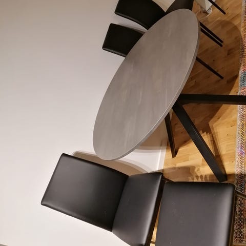 Matgruppen är sammansatt från flera olika inredningsbutiker, vilket ger ett personligt helhetsintryck. Alla delar är i mycket fint skick och bidrar till en enhetlig och genomtänkt matplats. Bordet har ett mindre kosmetiskt märke på skivan, men det är diskret och påverkar inte helhetskänslan.