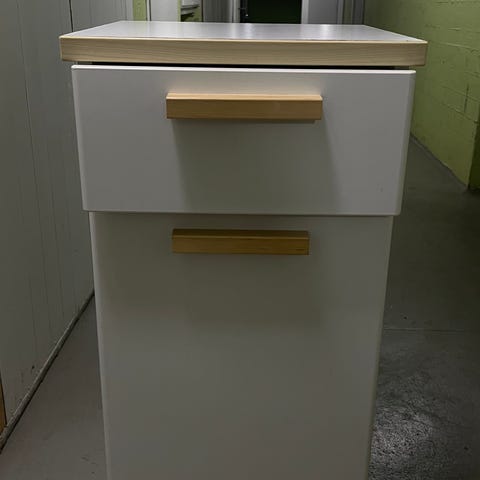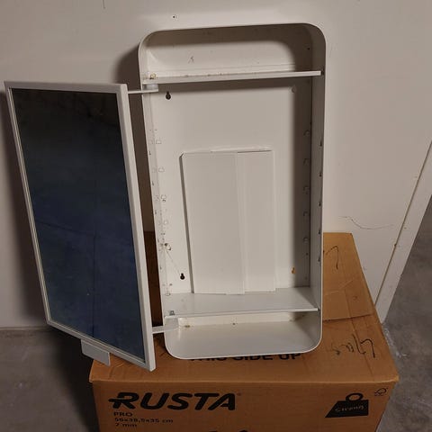 Ett badrumsskåp med två dörrar. Inuti finns hyllor för förvaring. Perfekt för badrummet att använda som tvättställsskåp