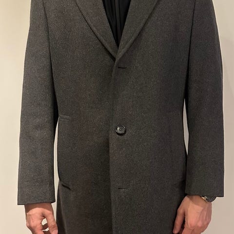 Säljer en elegant mörkgrå herrrock i klassisk, tidlös design. Rak och stilren passform som funkar perfekt både till vardag och mer uppklädda tillfällen.