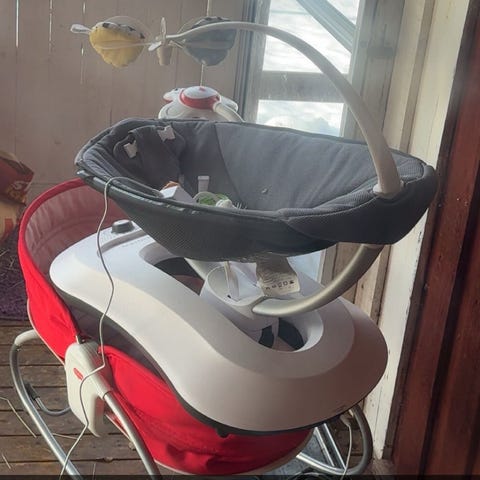 En fungerade baby vagga som vaggar, de ska vara att man kan spela ifrån den men den är sönder va sönder när ja köpte den själv begagnad. Finns liten insatts till. Finns i Hovmantorp