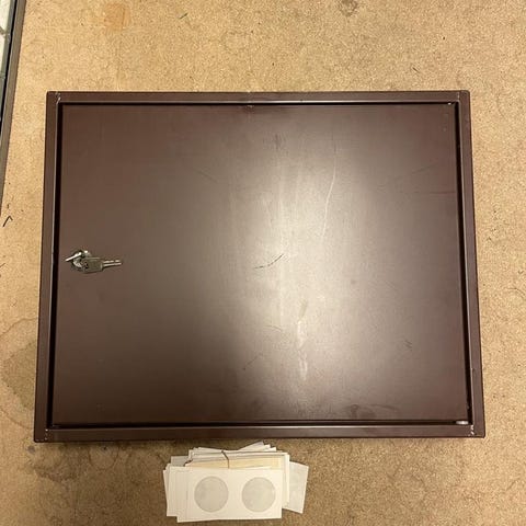 Smyckes-och Mynt/Sedlar Schatull med måtten b 270 mm x djup 230 mm x h 30 mm; har 3 st, fabr.nytt; fodrad med nån sorts sammet i mörkblått invändigt med 14 småfack och ett stort för sedlar eller foton mm, eller större smycke ; legat i garderoben i minst 25 år!, oanvänd ; present ell annat ändamål !