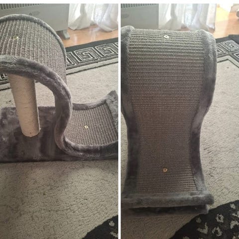 Grå klösbräda som sätts på hörn. Sitter 4 skruvar i, bara att montera upp på väggen.
