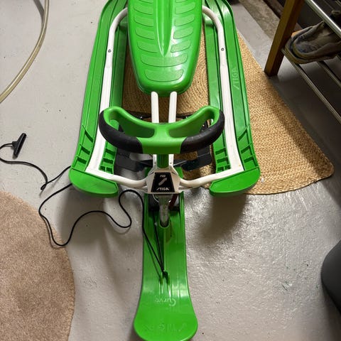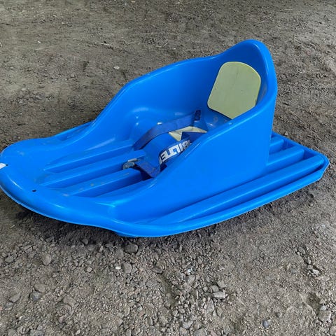 Pulka för barn i blå plast. Pulkan har sits med ryggstöd och dragsnöre framtill för att kunna dra den i snö. Lämplig för vinterlek och åkning i backe.