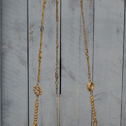 Taklampa i fotogenstil med grön glasskärm och mässingsfärgade metall detaljer. Lampan är upphängd i kedjor från takfäste och har central elektrisk ljuskälla. Runtom finns hållare för flera stearinljus. Under lampskärmen sitter en rund skärm med fransar som ger avskärmat ljus nedåt. Passar som belysning över matbord eller i vardagsrum där man vill ha en klassisk stil på inredningen.