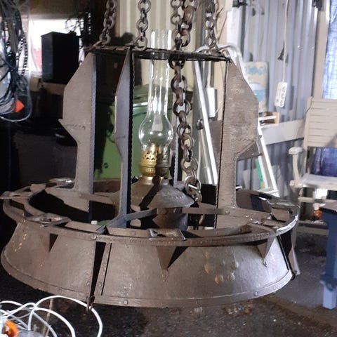 Taklampa fotogenstil med grön skärm och mässingsdetaljer