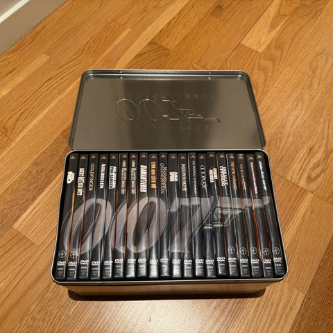 Helt oöppnad James Bond 007 DVD-box samlingsbox med flera filmer i serien samlade i en box. Förvaring i kartongfodral med individuella DVD-fodral för varje film. Lämplig för uppspelning på DVD-spelare som stödjer standard DVD-format.