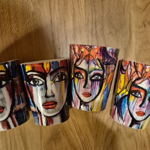 Carolina Gynning muggar med ansiktsmotiv flerfärgade