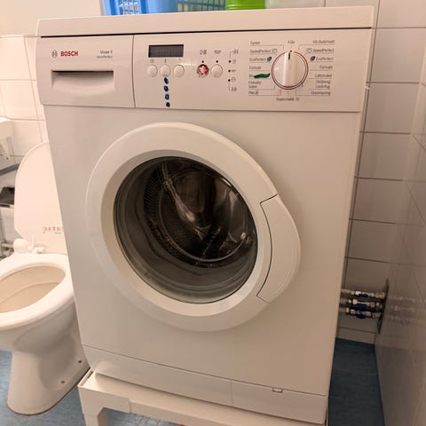 Bosch frontmatad tvättmaskin i vit färg. Tvättmaskinen har frontlucka med glasfönster och standardreglage på ovansidan. Passar för installation i badrum, tvättstuga eller kök där det finns anslutning för vatten och avlopp. Modellspecifik information om kapacitet och program saknas, se typskylt eller manual för exakta data.