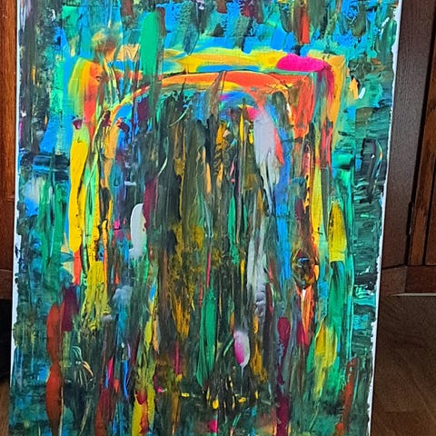 Abstrakt tavla med geometriska former och cirkulära mönster i gul, brun och mörka nyanser. Motivet har tydliga strukturer och linjer som skapar ett modernt, grafiskt uttryck. Passar som väggdekoration i vardagsrum, hall eller kontor. Målad på duk uppspänd på kilram och kan hängas direkt på väggen.