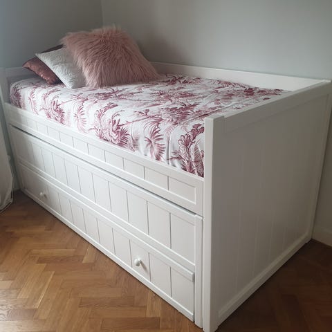 Hemnes från IKEA 80 cm madrass som blir 160 cm om man drar ut den. Absolut använd, hur mycket som helst! Lite skrapmärken här o där. Annars i helt okej skick. Madrasser ingår, grå skumgummi 2 st 80cmx200cm.