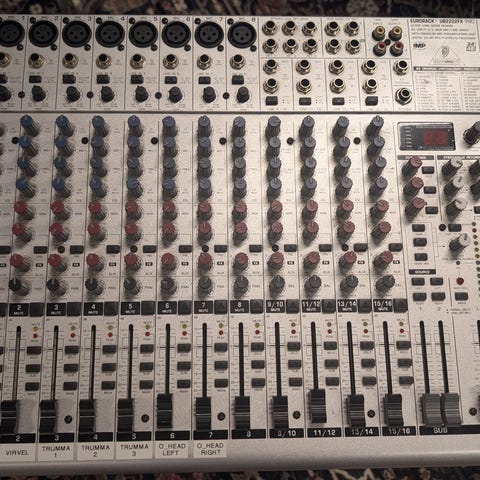 24-kanals mixer med fyra grupper. Rengjord och fräsch med rejält case.