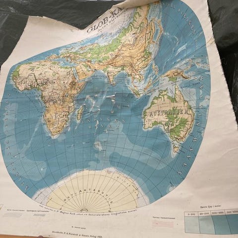 Gammal charmig skolkarta över södra Sverige. Flera större städer som Stockholm, Jönköping och Eskilstuna är markerade med symboler och tydlig text. Har en del små skavanker och skador, se bilder.