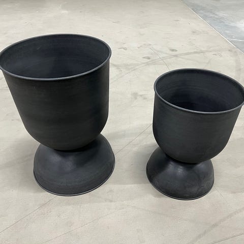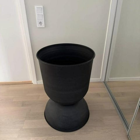 Ampel (kruka / hängkruka) från Ferm Living. Mörkare matt grå på utsidan och lite gråblå på insidan. Färg som runnit på insidan men inget som syns när en blomma är i och hänger uppe.