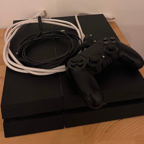 Sony Playstation 4 spelkonsol i svart färg. Konsolen visas tillsammans med en trådlös handkontroll, strömkabel och anslutningskablar. På bild syns även ett spel på skiva. Lämplig för spel, film och streaming via kompatibla tjänster och tillbehör.