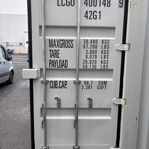 UETU 22G1 fraktcontainer på cirka 20 fot i blått stål. Märkningen visar max bruttovikt 30 480 kg, taravikt 2 185 kg och nettovikt 28 295 kg. Volymen är angiven till 33,2 kubikmeter (1 173 kubikfot). Containern är avsedd för lagring eller transport av gods och kan placeras utomhus på hårdgjord yta. Dörrarna är försedda med stålsprintar och låsbeslag för säker stängning.