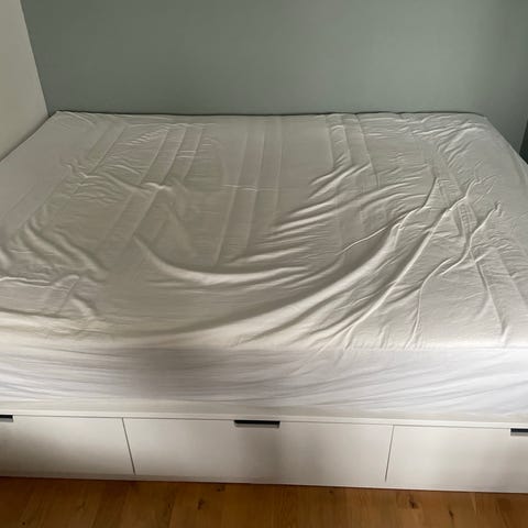 IKEA säng med förvaring i vit färg. Sängen har en hög gavl och utdragbara lådor undertill för extra förvaringsutrymme. Passar som standard dubbelsäng i sovrum där man vill kombinera säng och förvaring på en yteffektiv lösning. Materialet är en slät, vit yta som är lätt att torka av och hålla ren.