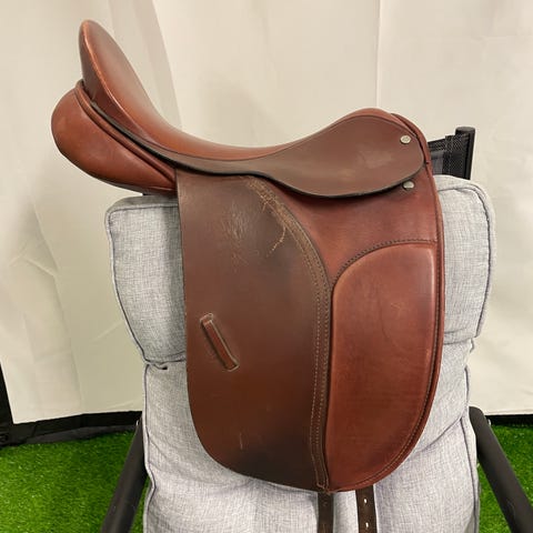 Sattlerei vom Kloster Schönthal Trenck-D II dressyrsadel i svart läder. Sadelns sits mäter cirka 17 tum. Utrustad med stigläder och stigbyglar enligt bild. Klassisk tysk dressyrmodell med djup sits och raka kåpor, anpassad för dressyrridning. Tillverkad i Tyskland, märkning finns på sadelns kåpa.