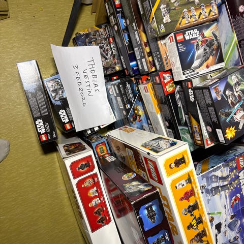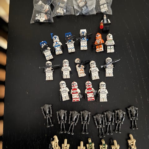 Lego Star Wars minifigurer och tillbehör i blandat parti. Bilderna visar ett större antal kompletta minifigurer uppställda på byggplattor samt en större påse med lösa delar som torsos, ben, huvuden och hjälmar. Det ingår även en separat påse med vapen och ljussablar. Flera olika typer av figurer ingår, bland annat soldater, droider och andra karaktärer från Star Wars-temat. Lämpligt som komplettering till befintliga Lego Star Wars-samlingar eller för eget bygge och lek. Antal figurer och delar framgår av bilderna.