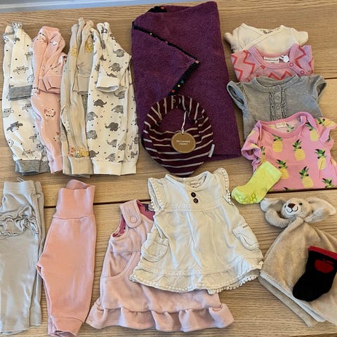 Klänning (PoP), one-piece (Minimarket), mössa (Rikiki), body (Lindex), byxor (HM samt Villervalla), pyjamas och dregglis (HM) etc.