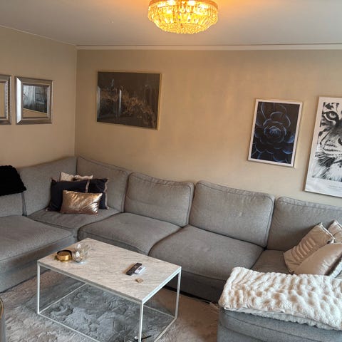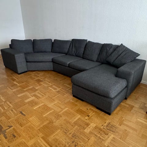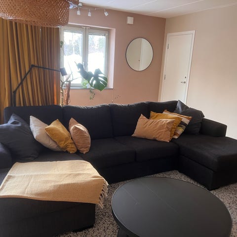 Säljer en sparsamt använd u-format soffa med kuddar i bra skick. Inga hål, repor eller fläckar. Alltid haft överkast på. Avtagbara överdrag på både kuddar och sittdel som kan tvättas om man vill.