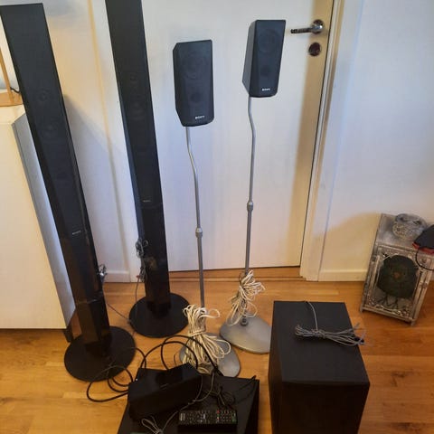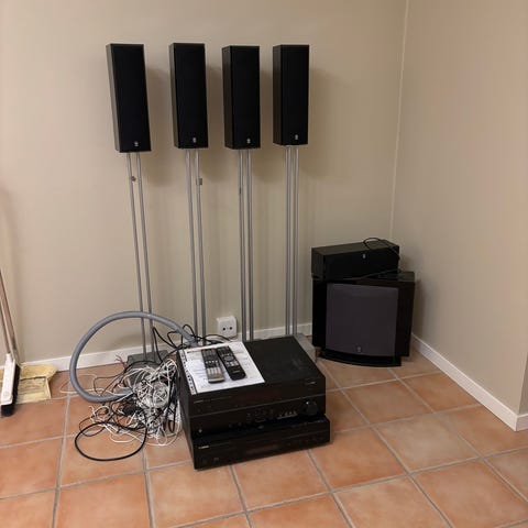 Yamaha hemmabiosystem i silverfärg. Systemet består av en hemmabioreceiver, en subwoofer samt flera högtalare för surroundljud. Passar för anslutning till tv och andra ljud- och bildkällor i vardagsrum eller mediarum. Designat för flerkanalsljud vid film, tv och musikuppspelning.
